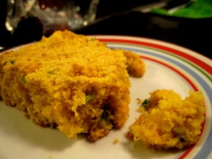 The recipe calls for milk or buttermilk. I don’t drink milk and really only use it in baking, substituting soy milk most other times. And usually it works out fine. I’ve made some damn good gratin potatoes with soy milk. The only thing I’ve had trouble with is alfredo sauce. My body cannot handle all that heavy cream but oh good Lord I love alfredo sauce. Soy milk, in my experience, when heated up and subbed for heavy cream in this case, gets sweet, and alfredo sauce should not be sweet. Does anyone have any tips on cooking with soy milk or other dairy substitutes? Anyway, back to the corn bread. I didn’t have milk and was almost out of soy milk. I did however have heavy cream for some weird reason, so used that instead. No need to do that I’m sure. I’d stick with milk or soy next time.