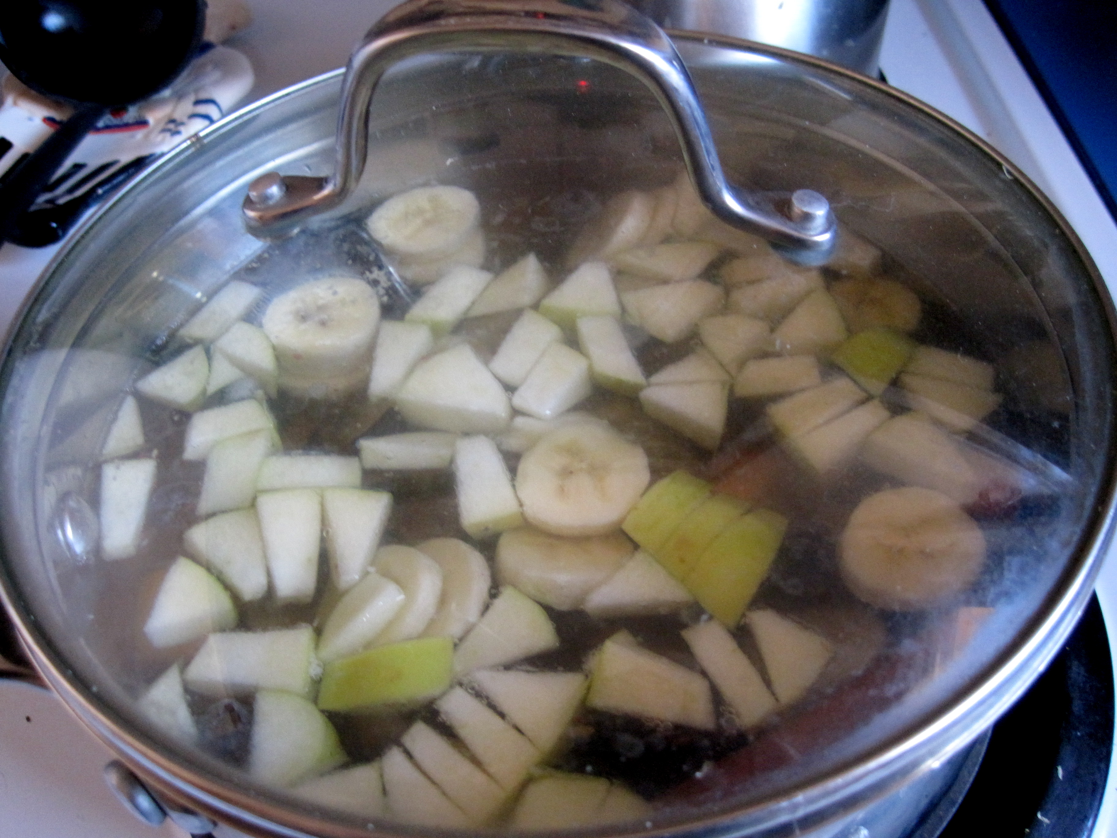 Ladle the cooked fruit mixture into a blender or food processor (when you find the cinnamon stick, remove it!), and puree. You’ll need to do this in batches most likely. Pour pureed soup into a large bowl and add the vanilla extract.