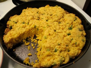 The recipe calls for milk or buttermilk. I don’t drink milk and really only use it in baking, substituting soy milk most other times. And usually it works out fine. I’ve made some damn good gratin potatoes with soy milk. The only thing I’ve had trouble with is alfredo sauce. My body cannot handle all that heavy cream but oh good Lord I love alfredo sauce. Soy milk, in my experience, when heated up and subbed for heavy cream in this case, gets sweet, and alfredo sauce should not be sweet. Does anyone have any tips on cooking with soy milk or other dairy substitutes? Anyway, back to the corn bread. I didn’t have milk and was almost out of soy milk. I did however have heavy cream for some weird reason, so used that instead. No need to do that I’m sure. I’d stick with milk or soy next time.